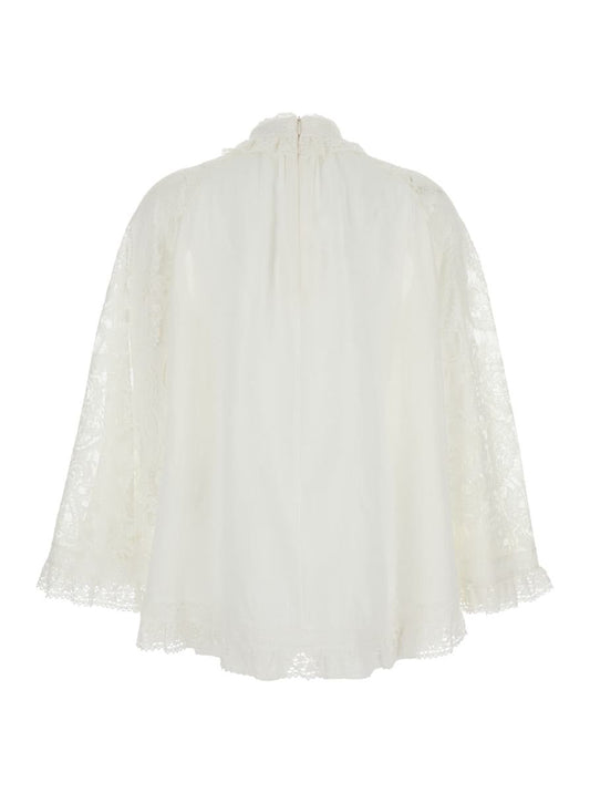 'Ascension' White Blouse With Lace Panels And Scallop Hem In Ramie Woman